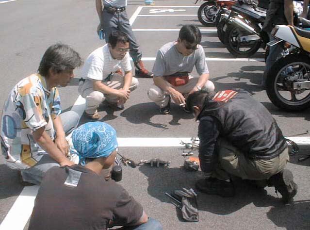 奥では炎天下にも関わらず、またバイク談義。